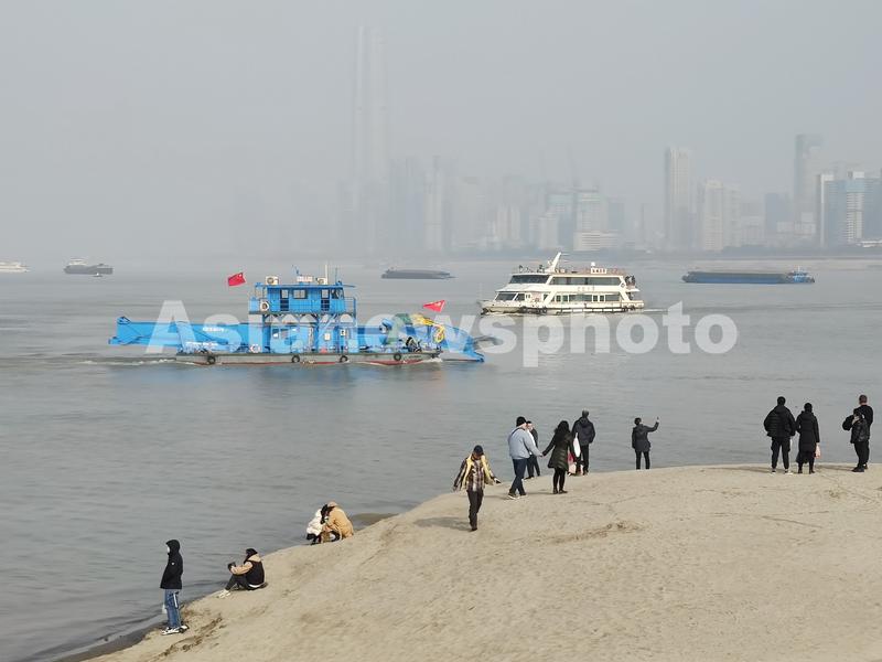 1月15日,武汉市市民在汉阳江滩长江岸坡边观江景。