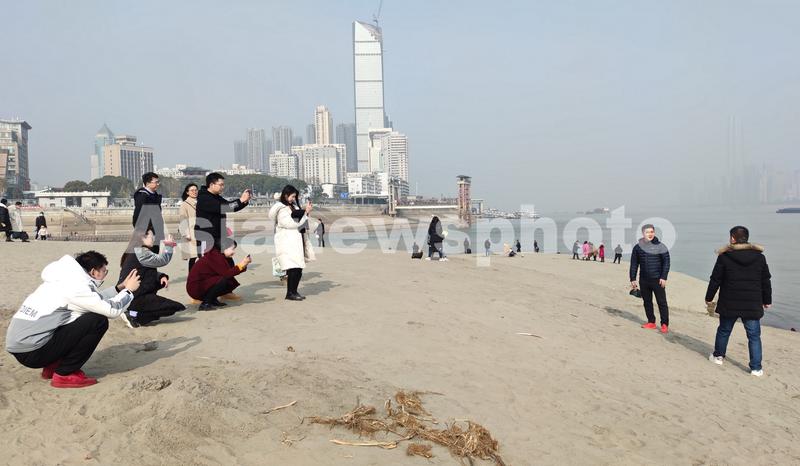 1月15日,武汉市市民在汉阳江滩长江岸坡边观江景。