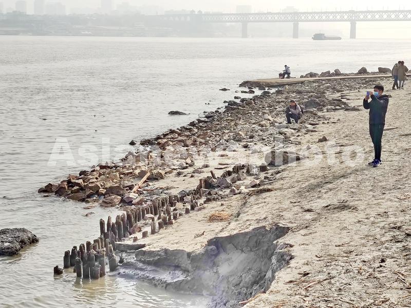 1月15日,位于长江汉江交汇的汉阳南岸嘴水域的泥砂显露成斜坡,保护堤坡墙体坡水面老旧护坡木桩石块全部见底。