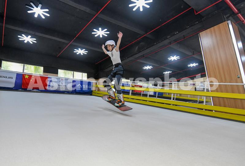 图片说明:2022年1月16日,在海南省海口市海甸岛一室内滑雪场,一小孩在仿真雪毯上体验冰雪运动的魅力。