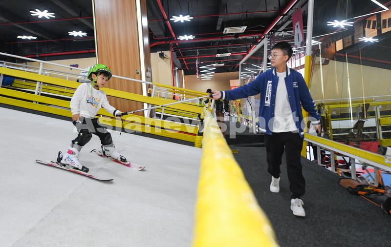 图片说明:2022年1月16日,在海南省海口市海甸岛一室内滑雪场,一小孩在教练的帮助下练习滑雪。