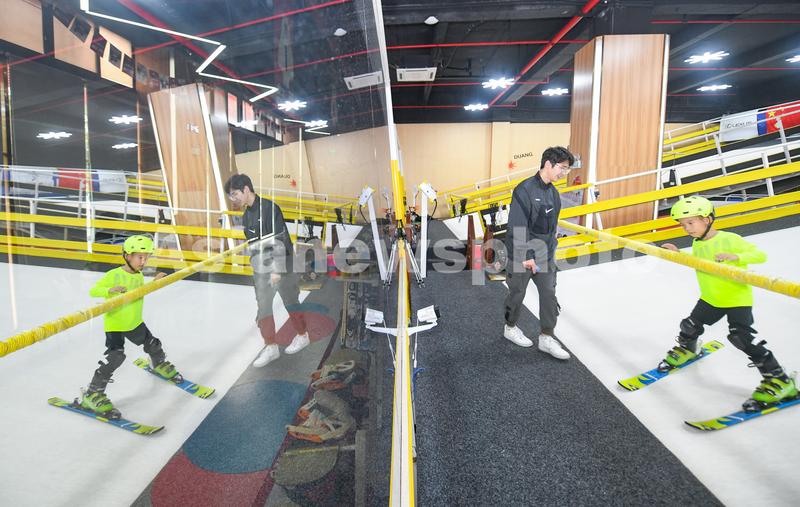 图片说明:2022年1月16日,在海南省海口市海甸岛一室内滑雪场,一小孩在教练的指导下练习滑雪。