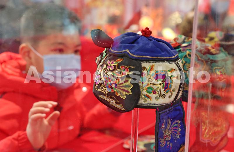 图片说明:2022年1月26日,观众参观“虎年101·事事如意”虎头帽展览。