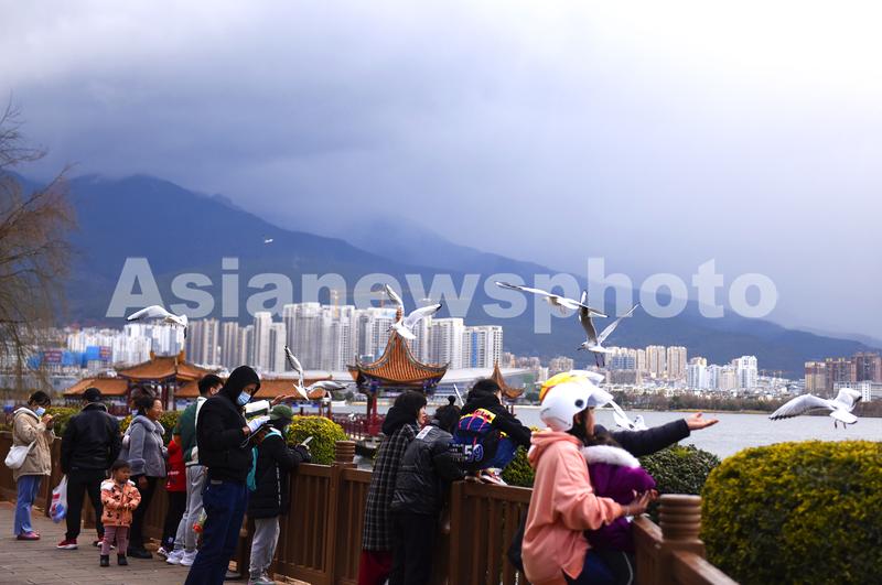 2022年1月27日,游客在云南省大理州大理市洱海公园海心亭洱海边观赏红嘴鸥。春节临近,来自西伯利亚成千上万只红嘴鸥在大理洱海越冬,红嘴鸥在洱海上空,时而展翅飞舞,时而嬉戏觅食,一幅人与自然和谐相处的美丽画卷。近年来,大理州全面加强洱海生态环境保护,洱海水质得到明显提升,生态环境持续改善,吸引了成群候鸟在洱海栖息越冬。