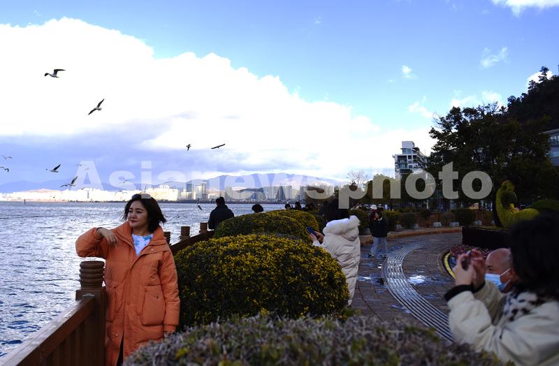 2022年1月27日,游客在云南省大理州大理市洱海公园海心亭洱海边观赏红嘴鸥。春节临近,来自西伯利亚成千上万只红嘴鸥在大理洱海越冬,红嘴鸥在洱海上空,时而展翅飞舞,时而嬉戏觅食,一幅人与自然和谐相处的美丽画卷。近年来,大理州全面加强洱海生态环境保护,洱海水质得到明显提升,生态环境持续改善,吸引了成群候鸟在洱海栖息越冬。