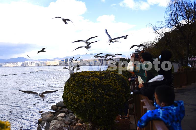 2022年1月27日,游客在云南省大理州大理市洱海公园海心亭洱海边观赏红嘴鸥。春节临近,来自西伯利亚成千上万只红嘴鸥在大理洱海越冬,红嘴鸥在洱海上空,时而展翅飞舞,时而嬉戏觅食,一幅人与自然和谐相处的美丽画卷。近年来,大理州全面加强洱海生态环境保护,洱海水质得到明显提升,生态环境持续改善,吸引了成群候鸟在洱海栖息越冬。