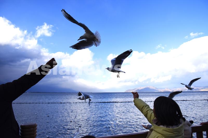 2022年1月27日,游客在云南省大理州大理市洱海公园海心亭洱海边观赏红嘴鸥。春节临近,来自西伯利亚成千上万只红嘴鸥在大理洱海越冬,红嘴鸥在洱海上空,时而展翅飞舞,时而嬉戏觅食,一幅人与自然和谐相处的美丽画卷。近年来,大理州全面加强洱海生态环境保护,洱海水质得到明显提升,生态环境持续改善,吸引了成群候鸟在洱海栖息越冬。