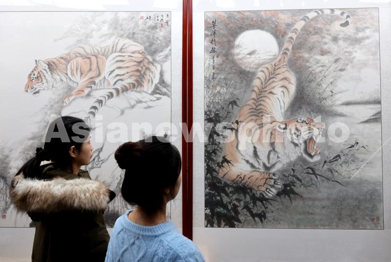 图片说明:2022年1月27日,在山东省枣庄市光明路街道石碑社区民间艺人靳学勤的庭院中,社区居民在观看靳学勤创作的老虎画。