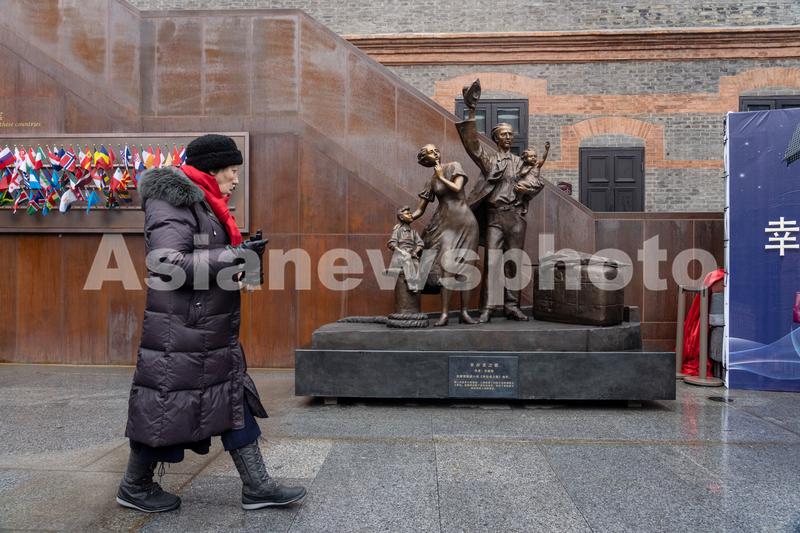 图片说明:生活在上海的犹太难民后裔沙拉·伊马斯Sara Imas从雕塑《幸存者之歌》前走过。