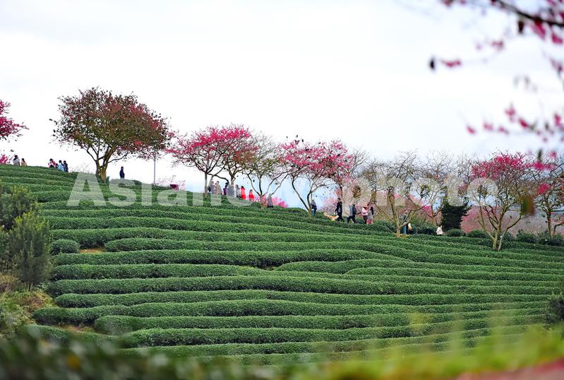 图片说明:2022年2月5日,福建省龙岩市漳平市永福镇樱花茶旅景区,游客漫步在台品樱花茶园观赏美景。