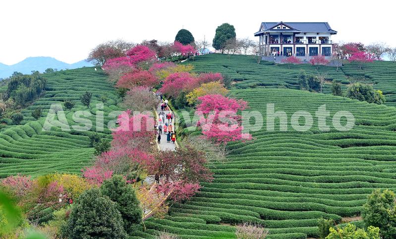 图片说明:2022年2月5日,福建省龙岩市漳平市永福镇樱花茶旅景区,游客漫步在台品樱花茶园观赏美景。