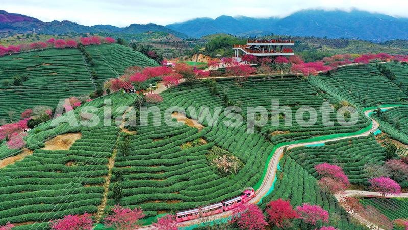 图片说明:2022年2月5日,福建省龙岩市漳平市永福镇台品樱花茶园,游客乘坐电动“小火车”在观赏茶园美景。