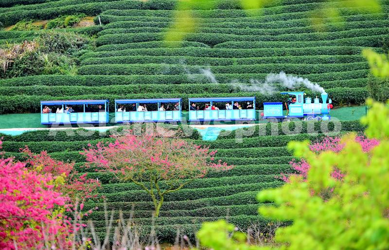 图片说明:2022年2月5日,福建省龙岩市漳平市永福镇台品樱花茶园,游客乘坐电动“小火车”在观赏茶园美景。