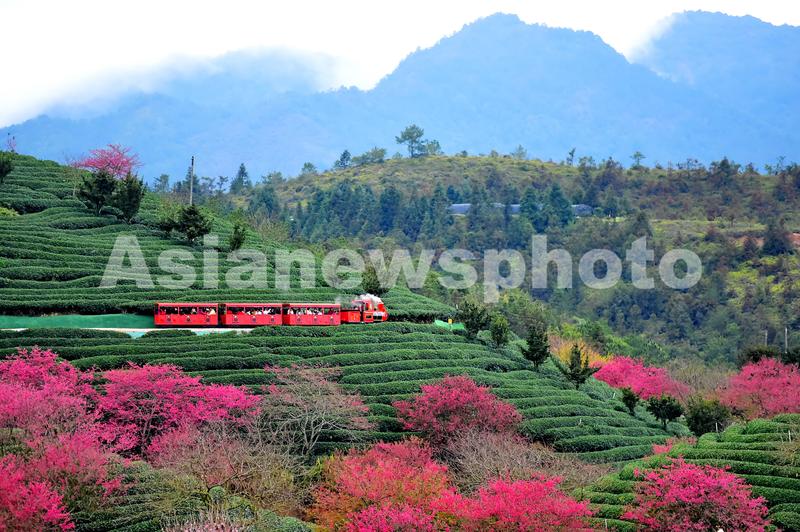 图片说明:2022年2月5日,福建省龙岩市漳平市永福镇台品樱花茶园,游客乘坐电动“小火车”在观赏茶园美景。