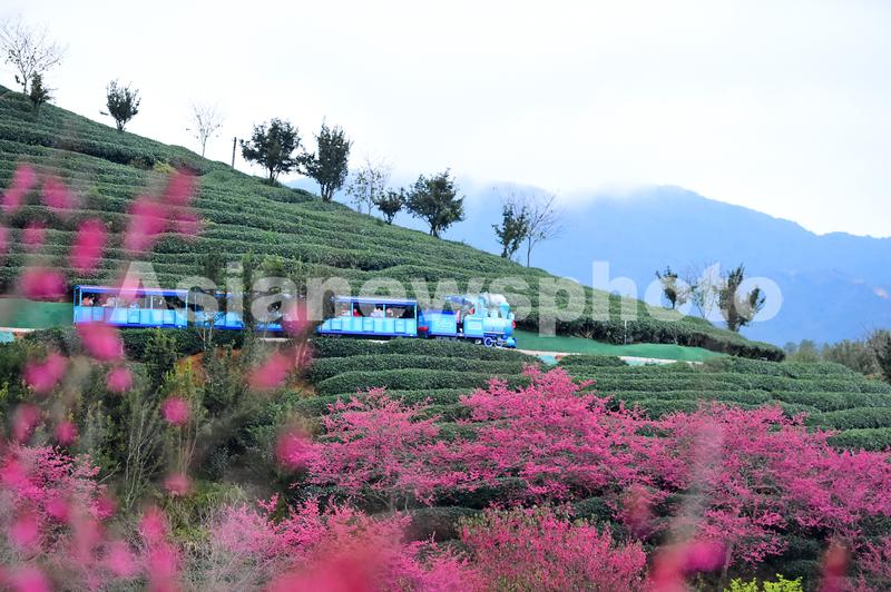 图片说明:2022年2月5日,福建省龙岩市漳平市永福镇台品樱花茶园,游客乘坐电动“小火车”在观赏茶园美景。