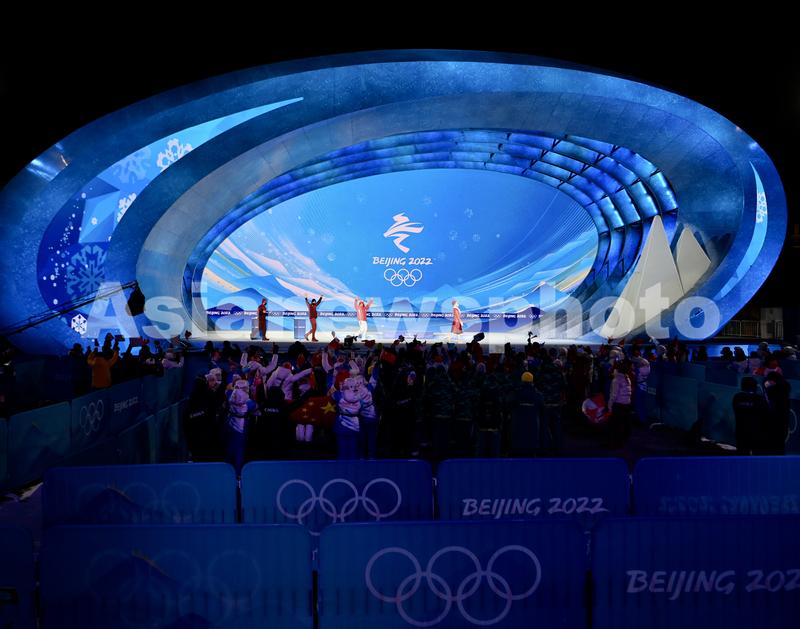 北京2022年冬奥会单板滑雪项目男子坡面障碍技巧决赛颁奖仪式现场,获奖选手走上领奖台。