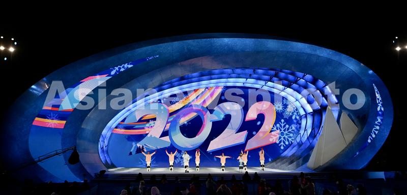 北京2022年冬奥会单板滑雪项目男子坡面障碍技巧决赛颁奖仪式现场的文艺表演。