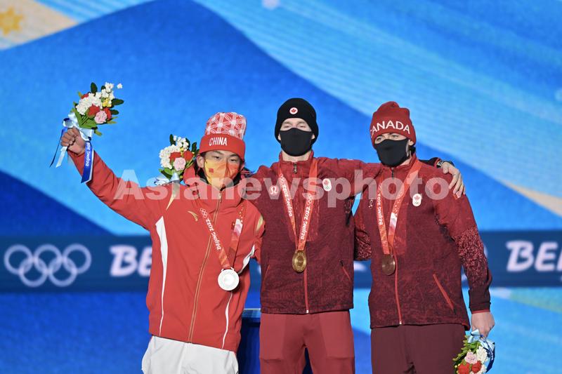 中国选手苏翊鸣、加拿大选手马克斯·帕罗特、马克·麦克莫里斯(从左至右)共同站上领奖台。
