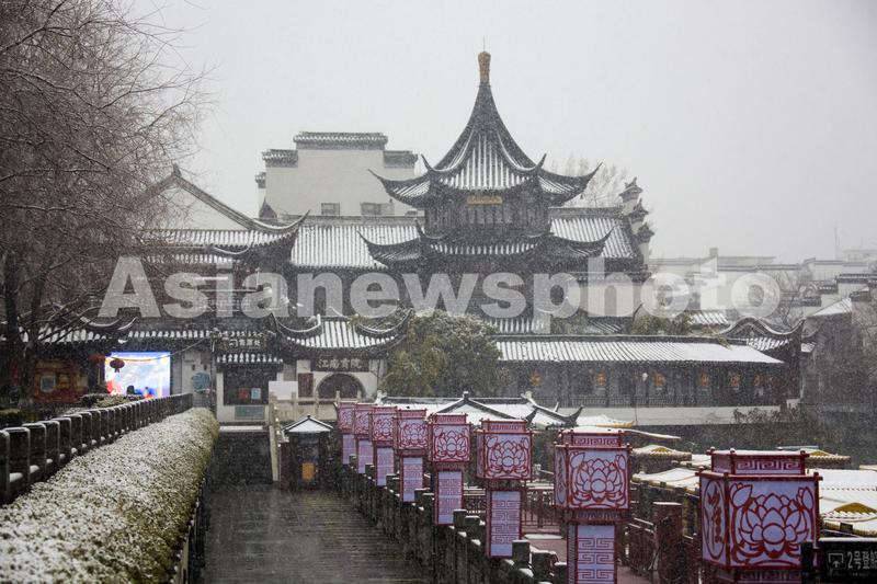 图片说明:2月7日拍摄的南京夫子庙景区秦淮河两岸雪景。