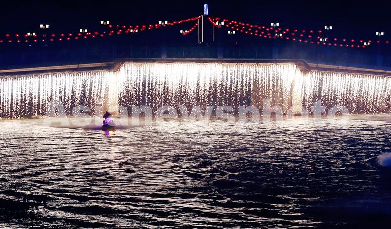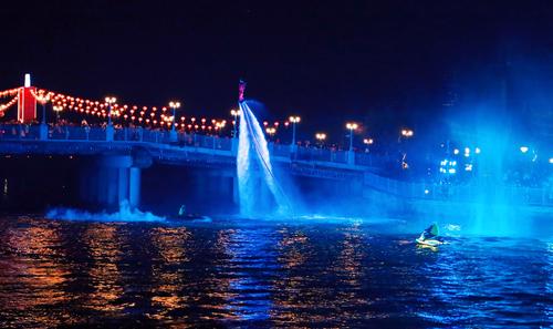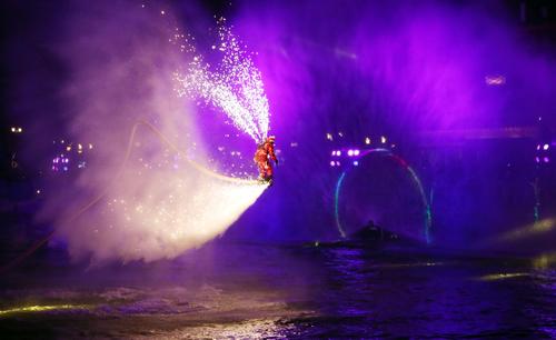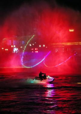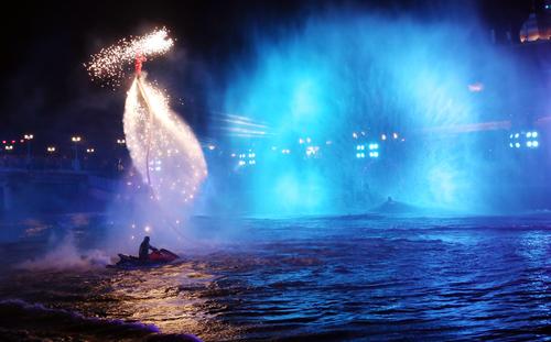 2022年2月4日,上海,临港新城地标旅游景点海昌海洋公园举办新年游园会,图为水幕光影秀中摩托艇的动感特技表演:穿越烟火灯笼桥。
