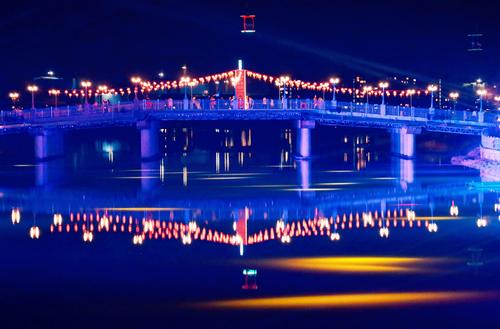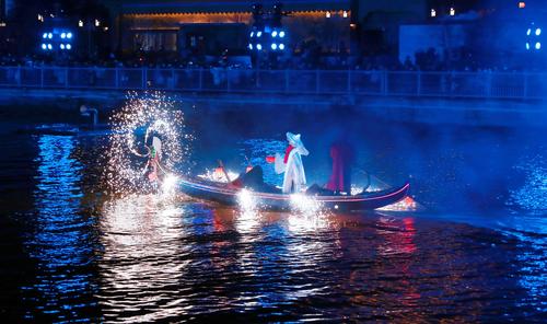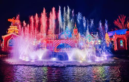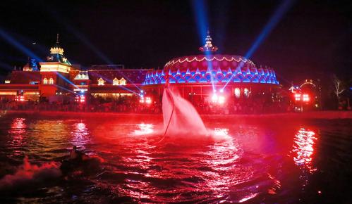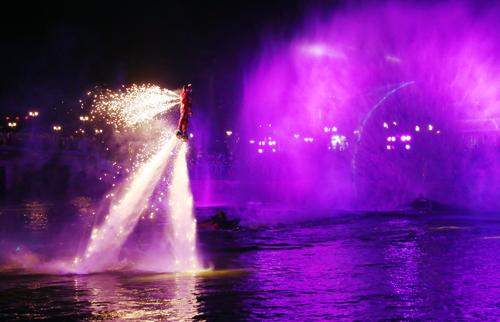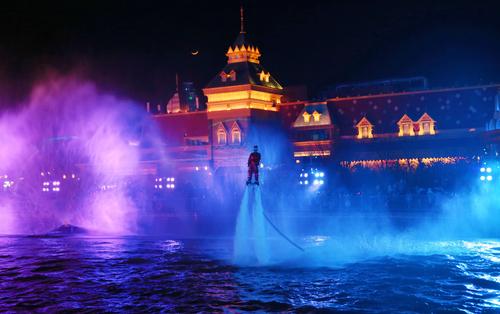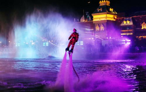 2022年2月4日,上海,临港新城地标旅游景点海昌海洋公园举办新年游园会,结合水上特技的水幕光影秀作为贺岁大戏震撼上演,特技演员身着传统喜庆服饰、戴着虎头帽进行酷炫水上飞人表演,摩托艇在湖中飞驰“伴舞”,结合奇幻激光秀和烟火秀,搭配游乐园童话建筑的灯光照明,夜景视觉效果梦幻唯美。