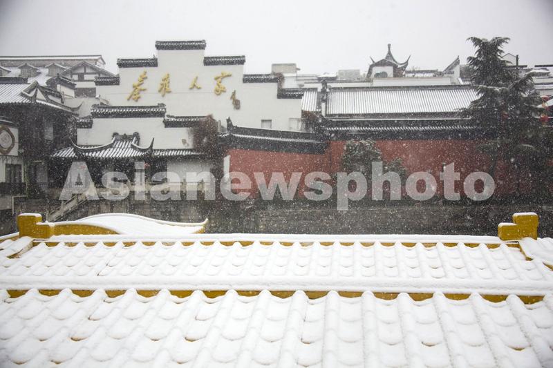 图片说明:2月7日拍摄的南京夫子庙景区秦淮河两岸雪景。