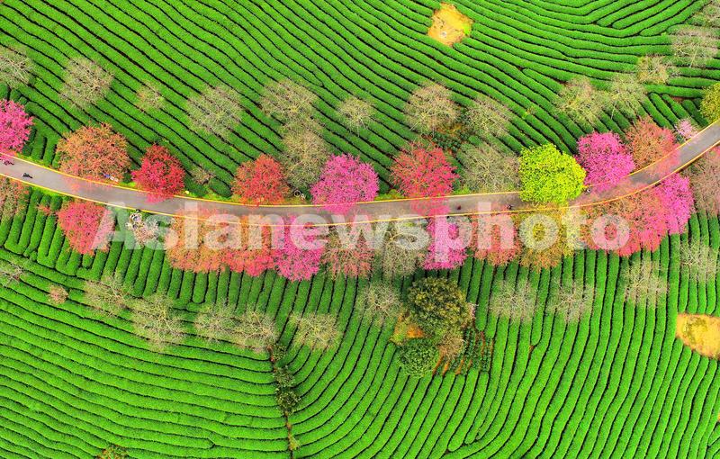 春节期间,漳平市永福镇台湾农民创业园台品茶园樱花,数十万株、四十多个品种的樱花竞相绽放,红色樱花与绿色茶园交相辉映,景色美不胜收,吸引了众多游客前来赏花观景。