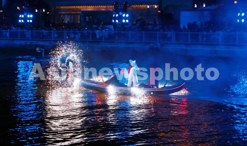 2022年2月4日,上海,临港新城地标旅游景点海昌海洋公园举办新年游园会,图为水幕光影秀演出中的烟火小舟浪漫唯美。