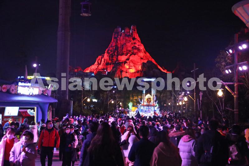2022年2月4日,上海,临港新城旅游地标海昌海洋公园火山鲨鱼馆是全球首条仿生鲸鲨表演舞台,夜景吸引众多游客。