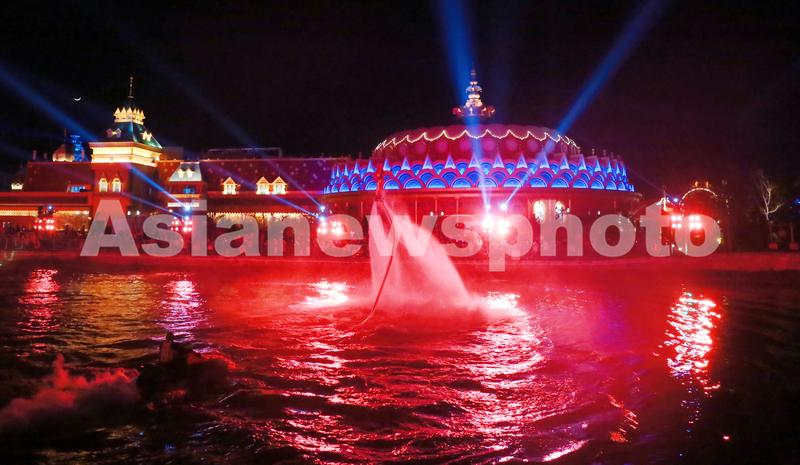 2022年2月4日,上海,临港新城地标旅游景点海昌海洋公园举办新年游园会,结合水上特技的水幕光影秀作为贺岁大戏震撼上演,特技演员身着传统喜庆服饰、戴着虎头帽进行酷炫水上飞人表演,摩托艇在湖中飞驰“伴舞”,结合奇幻激光秀和烟火秀,搭配游乐园童话建筑的灯光照明,夜景视觉效果梦幻唯美。