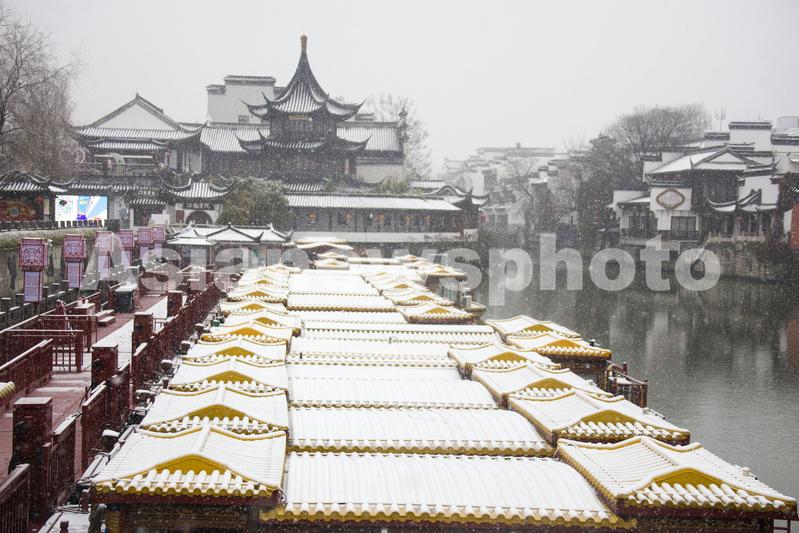 图片说明:2月7日拍摄的南京夫子庙景区秦淮河两岸雪景。