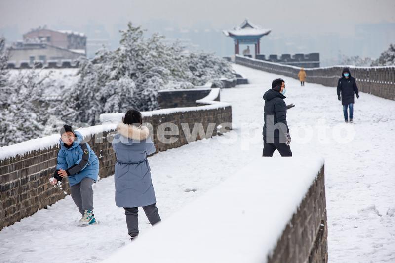 2022年2月7日,湖北省襄阳市,受冷空气影响,襄阳古城迎来立春后的首场降雪。雪后的襄阳古城,银装素裹,景色如画。人们走出家门,赏雪游古城。