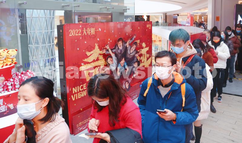 2022年2月1日,上海,春节档国产贺岁电影票房人气足,观众在电影院排队入场观看文牧野与易烊千玺合作的亲情友情励志片《奇迹·笨小孩》。