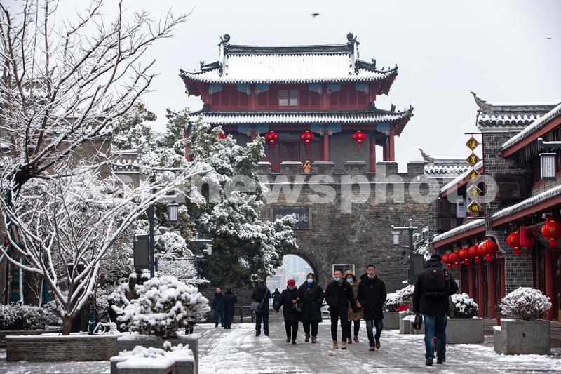 2022年2月7日,湖北省襄阳市,受冷空气影响,襄阳古城迎来立春后的首场降雪。雪后的襄阳古城,银装素裹,景色如画。人们走出家门,赏雪游古城。