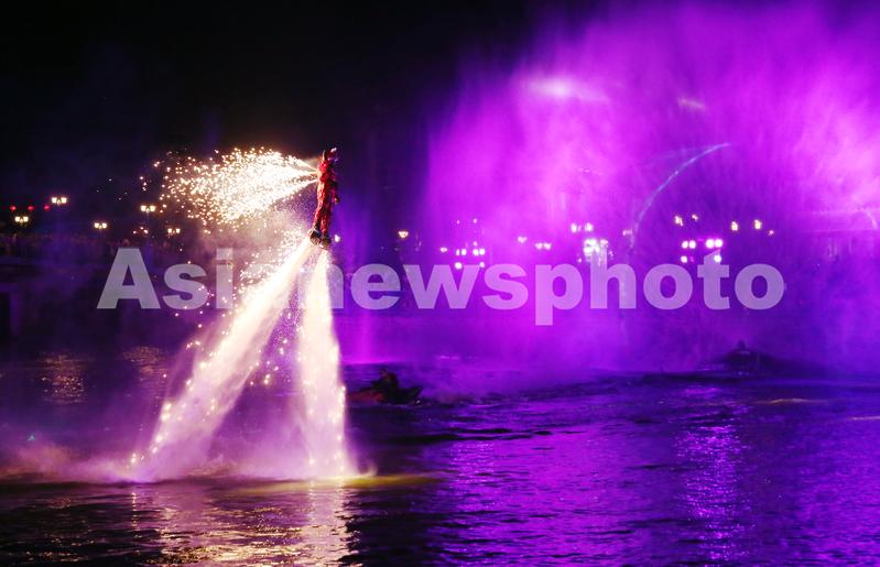 2022年2月4日,上海,临港新城地标旅游景点海昌海洋公园举办新年游园会,图为水幕光影秀上,水上飞人和摩托艇特技演员配合进行酷炫表演。