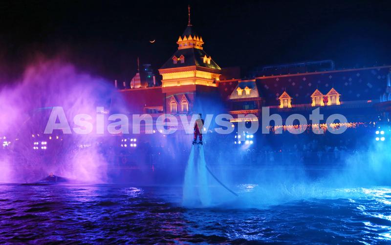 2022年2月4日,上海,临港新城地标旅游景点海昌海洋公园举办新年游园会,图为水幕光影秀特技演员进行酷炫水上飞人表演。