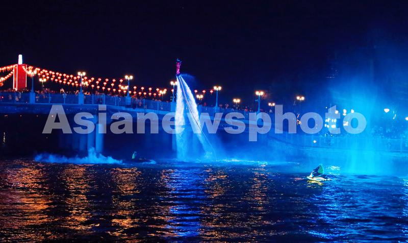 2022年2月4日,上海,临港新城地标旅游景点海昌海洋公园举办新年游园会,图为水幕光影秀上,水上飞人和摩托艇特技演员配合进行酷炫表演。