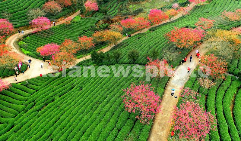 春节期间,漳平市永福镇台湾农民创业园台品茶园樱花,数十万株、四十多个品种的樱花竞相绽放,红色樱花与绿色茶园交相辉映,景色美不胜收,吸引了众多游客前来赏花观景。