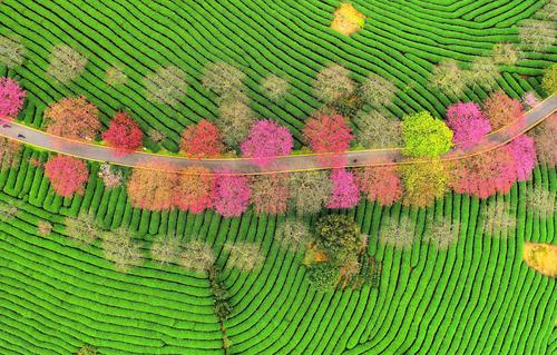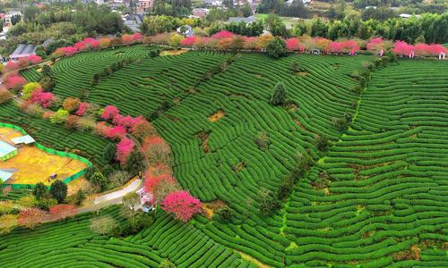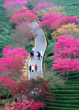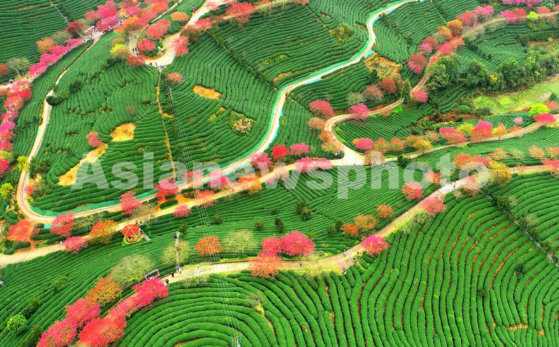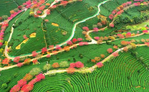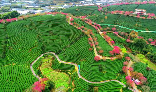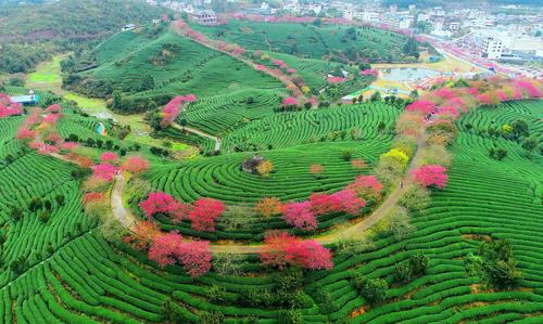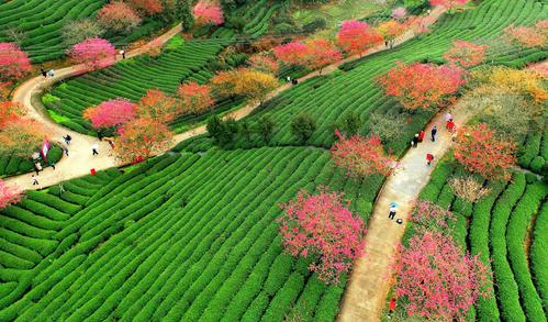 春节期间,漳平市永福镇台湾农民创业园台品茶园樱花,数十万株、四十多个品种的樱花竞相绽放,红色樱花与绿色茶园交相辉映,景色美不胜收,吸引了众多游客前来赏花观景。