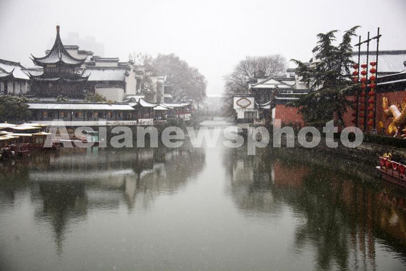 图片说明:2月7日拍摄的南京夫子庙景区秦淮河两岸雪景。