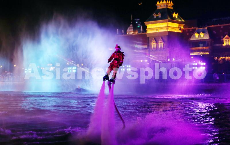 2022年2月4日,上海,临港新城地标旅游景点海昌海洋公园举办新年游园会,图为水幕光影秀特技演员进行酷炫水上飞人表演。