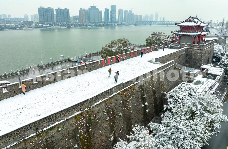 2022年2月7日,湖北省襄阳市,受冷空气影响,襄阳古城迎来立春后的首场降雪。雪后的襄阳古城,银装素裹,景色如画。人们走出家门,赏雪游古城。