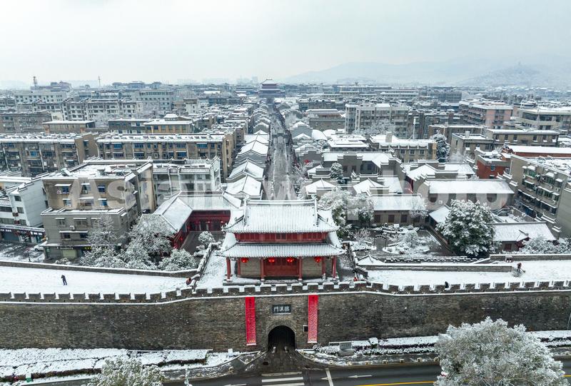 2022年2月7日,湖北省襄阳市,受冷空气影响,襄阳古城迎来立春后的首场降雪。雪后的襄阳古城,银装素裹,景色如画。人们走出家门,赏雪游古城。