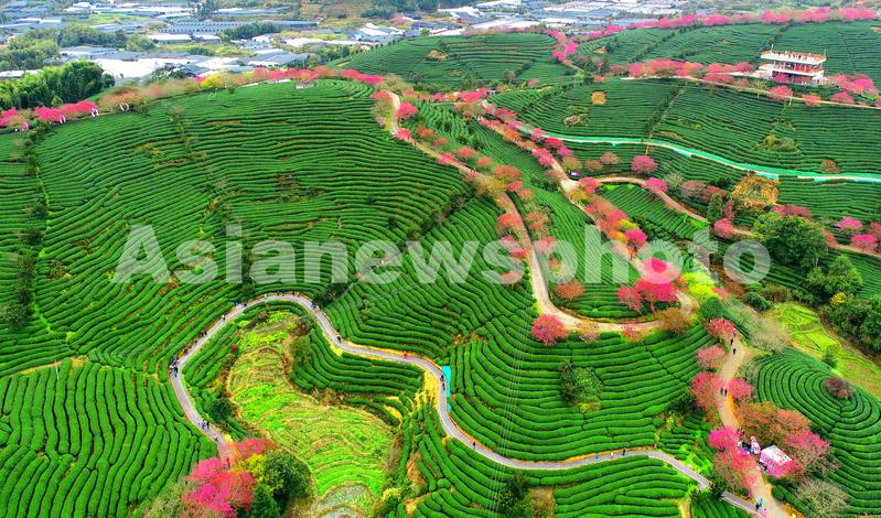 春节期间,漳平市永福镇台湾农民创业园台品茶园樱花,数十万株、四十多个品种的樱花竞相绽放,红色樱花与绿色茶园交相辉映,景色美不胜收,吸引了众多游客前来赏花观景。