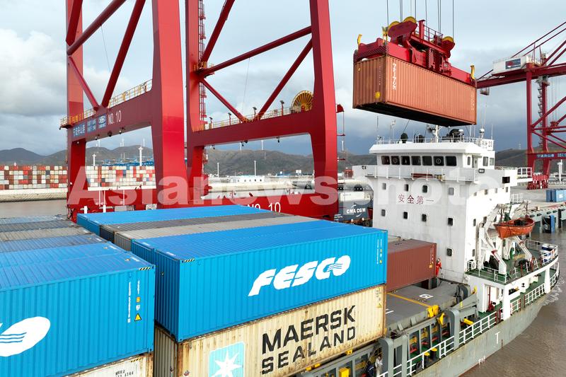 图片说明:2022年2月8日下午,宁波舟山港金塘港区大浦口集装箱码头3号泊位上, 编号为10的远控桥吊正在为 “联合23”轮进行装船作业。当天,大浦口集装箱码头3号泊位正式投入运营。