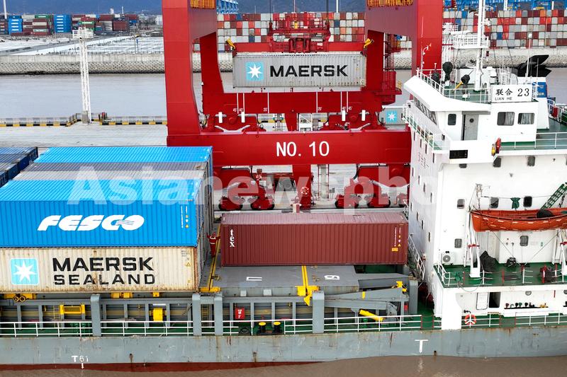 图片说明:2022年2月8日下午,宁波舟山港金塘港区大浦口集装箱码头3号泊位上, 编号为10的远控桥吊正在为 “联合23”轮进行装船作业。当天,大浦口集装箱码头3号泊位正式投入运营。
