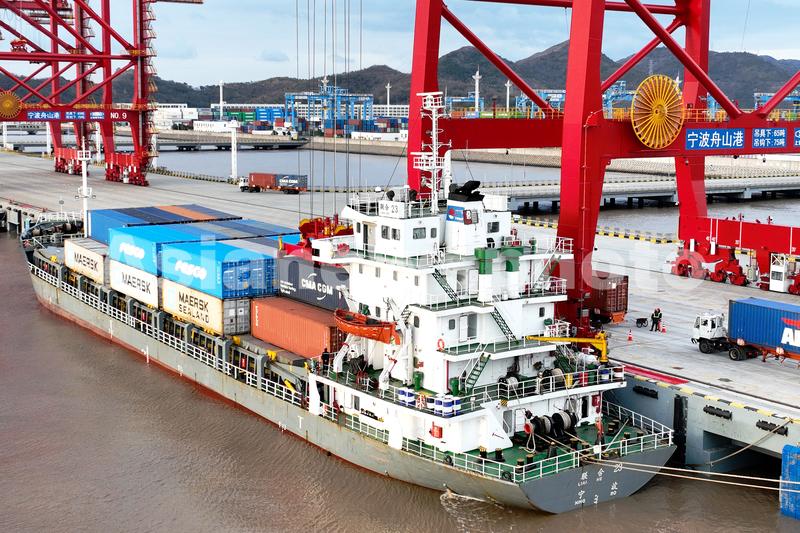 图片说明:2022年2月8日下午,宁波舟山港金塘港区大浦口集装箱码头3号泊位上, 编号为10的远控桥吊正在为 “联合23”轮进行装船作业。当天,大浦口集装箱码头3号泊位正式投入运营。
