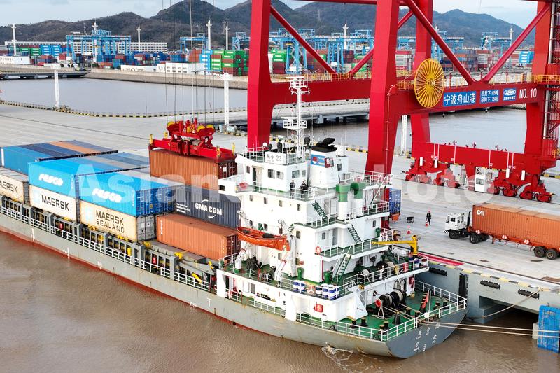 图片说明:2022年2月8日下午,宁波舟山港金塘港区大浦口集装箱码头3号泊位上, 编号为10的远控桥吊正在为 “联合23”轮进行装船作业。当天,大浦口集装箱码头3号泊位正式投入运营。