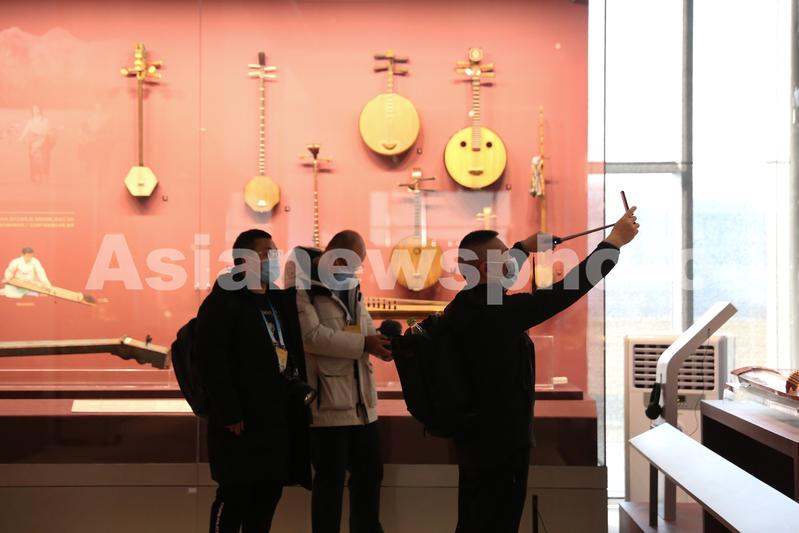 图片说明:媒体记者拍摄展出的传统乐器。