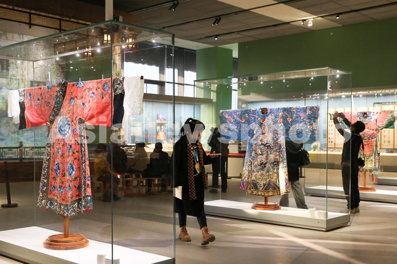 图片说明:媒体记者拍摄展出的传统戏服。